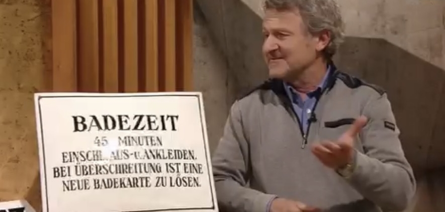 “Was hat es mit dem Schild mit der Badezeit auf sich? 45 Minuten Badezeit?”, fragte Norbert. Das ist vermutlich nicht das Schönbrunnerbad, oder warum geht das? Ist das das Tröpfchenbad, das legendäre? Das ist das Tröpfchenbad von Piron und Knapp. Wirklich schön instrumentiert, was sich da so alles abspielt. Da gibt es ja das Röntgenbild. Amanda, wie ein Röntgenbild sozusagen eigentlich dann über dem Kanal wegrutscht. Wie viel muss man da hinlegen, wenn man sowas am Flohmarkt oder im Flohmarkt-Ibidetenladen verteilgt?