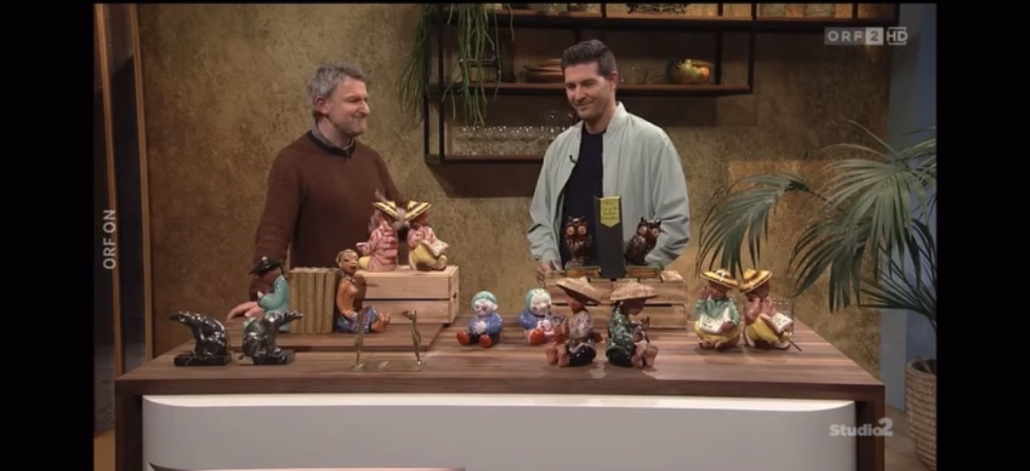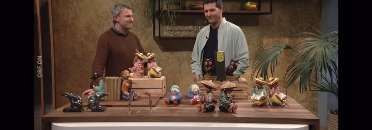 Auch französische Buchstützen aus schwarzem Marmor sind begehrt. Dazu meinte ich: “Dieser Marmor wird heute gar nicht mehr abgebaut, was diese Stücke besonders macht. Alle kennen Carrara Marmor, den schneeweißen Marmor mit dieser feinen Aderung. Und das war eine kleine Mine, die es dort gab und die seit 50 Jahren sozusagen nicht mehr bewirtschaftet werden kann. Und das sind die richtig schönen. Das ist ein stilisierter Eisbär. Die hier? 600 bis 700 Euro wert.” Walter Bosse wiederum setzte mit humorvollen Tierfiguren besondere Akzente: “Max und Moritz, ein Bauernpaar – und da gibt es einen prominenten Sammler: den Schriftsteller Robert Menasse. Der deutsche Buchpreisträger ist seit über 30 Jahren begeisterter Sammler.” Und ich bin einer seiner „Dealer“.
