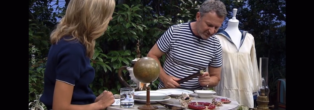 Natürlich wecken auch Objekte wie ein Haigebiss (heikle Geschichte), über hundert Jahre alt, oder ein Fernrohr (Markenware, wunderschöne Signatur, Wert 300 Euro mit Linsenschutz) mit dem man privat Pirat spielen kann, sofort Sehnsucht nach Meer. Und mein teuerstes Stück diesmal: ein originaler Matrosenanzug der k.u.k.-Marine von 1907, 5er Größe, komplett mit Stephanskrone, Rangabzeichen und sogar dem Namen des Matrosen, (Wert 800 Euro, Drei Stern Matrose, die höchste Kategorie) der ihn einst trug. Ein außergewöhnliches Stück Geschichte.